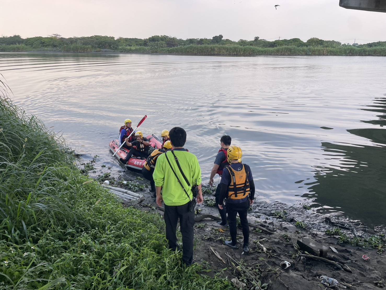 17時14分現場消防隊員回報,將落水婦人拉回岸上,已無生命徵象,後續交由員警調查處理。