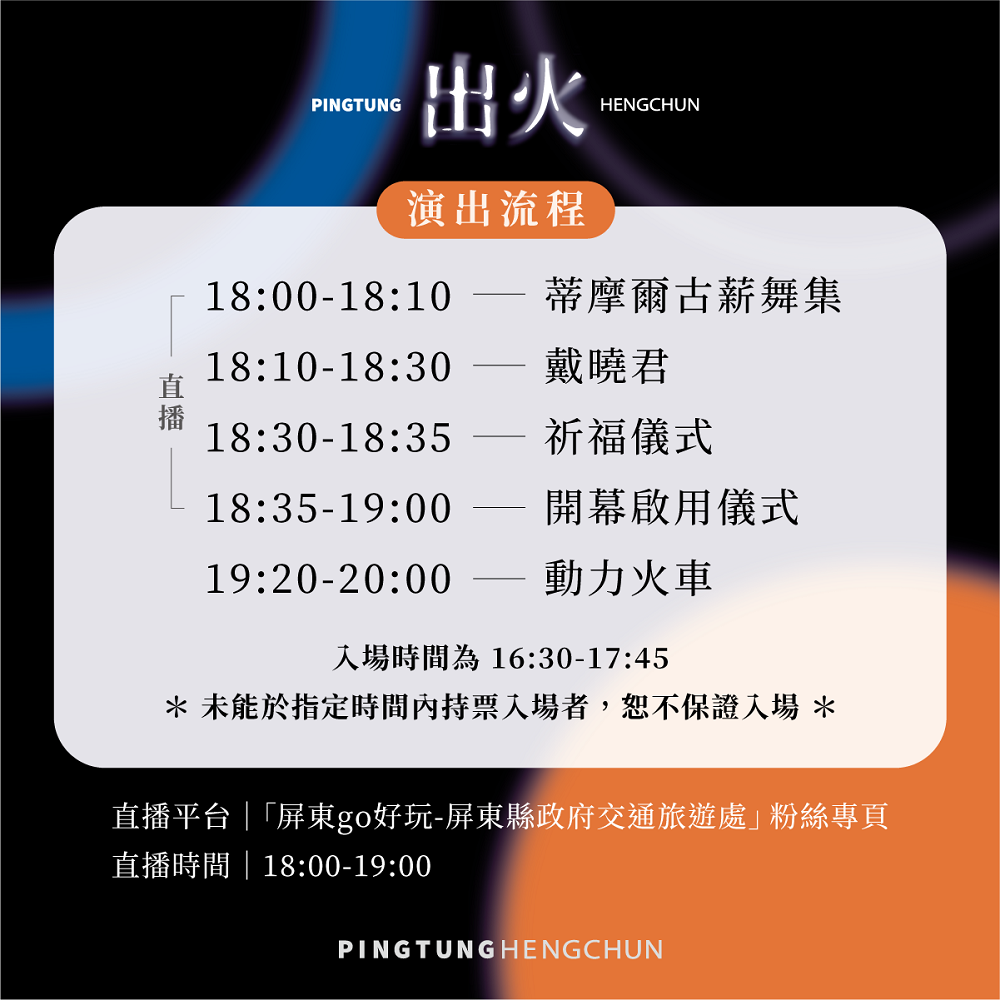 出火地質公園將於2月1日晚間6時正式開幕,由蒂摩爾古薪舞集揭開序幕,接續戴曉君Sauljaljui演出並進行祈福儀式,向祖靈祈求平安與祝福,壓軸邀請動力火車帶來40分鐘經典金曲,點燃冬季最熱情的夜晚。開幕式將會於屏東go好玩粉絲專頁線上直播,動力火車的演出因涉及版權等問題,將無法進行線上直播,敬請民眾見諒。