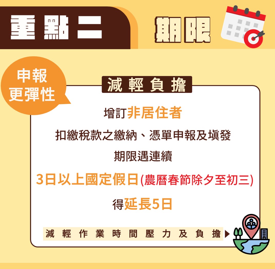 二、非居住者扣繳申報:給付非居住者代扣稅款之日起算10日內遇連續3日以上國定假日者,比照居住者扣繳時限彈性,所扣稅款繳納、扣繳憑單申報核驗及發給期間延長五日,該分局舉例說明,115年2月10日給付非居住者,原規定申報迄日至115年2月19日,因中間遇連續5天國定假日,故申報延長至115年2月24日。