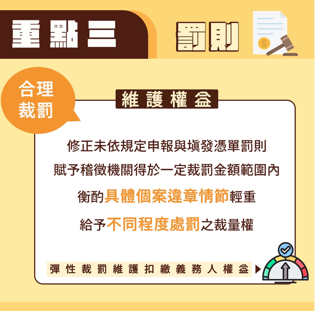 三、扣繳罰鍰裁量權:未依規定申報與填報憑單處罰規定,114年1月1日以後給付一律適用新制裁處規定,稽徵機關得於一定裁罰金額範圍內衡酌具體個案違章情節輕重,給予不同程度處罰之裁量權,維護扣繳義務人權益。