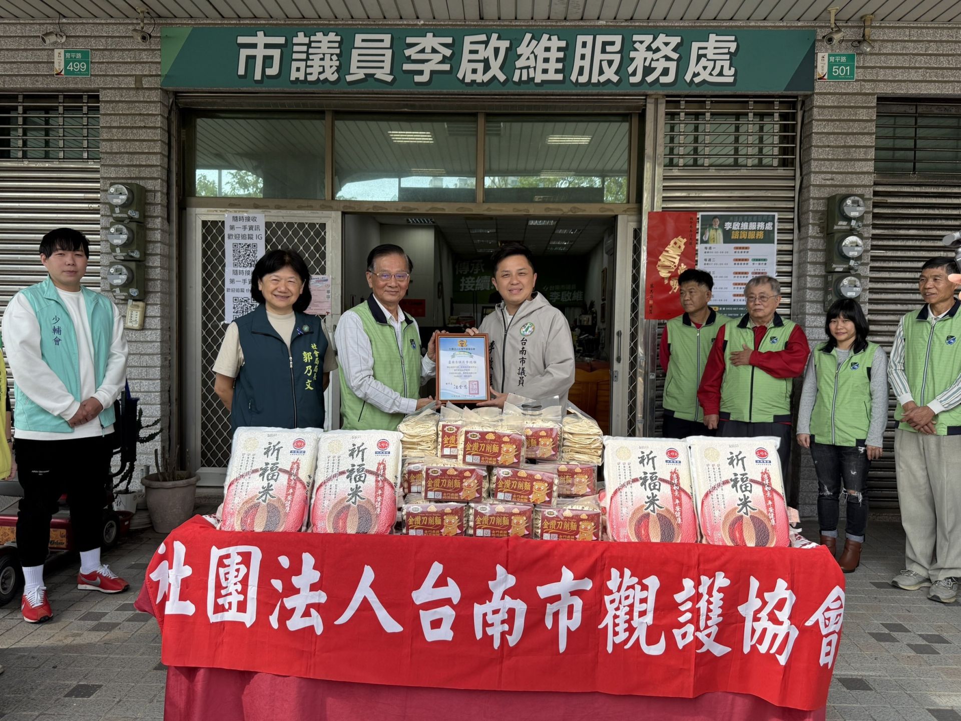 春節即將到來!為關懷弱勢非行少年及其家庭,市議員李啟維服務處邀各界善心人士及熱心企業,共同捐助逾千公斤米麵及9萬元給社團法人台南市觀護協會。27日上午在安平區李啟維議員服務處舉行捐贈儀式,社會局長郭乃文特別到場見證,由觀護協會理事長江金忠、秘書長劉文欽及多位理事代表受贈,場面溫馨感人。