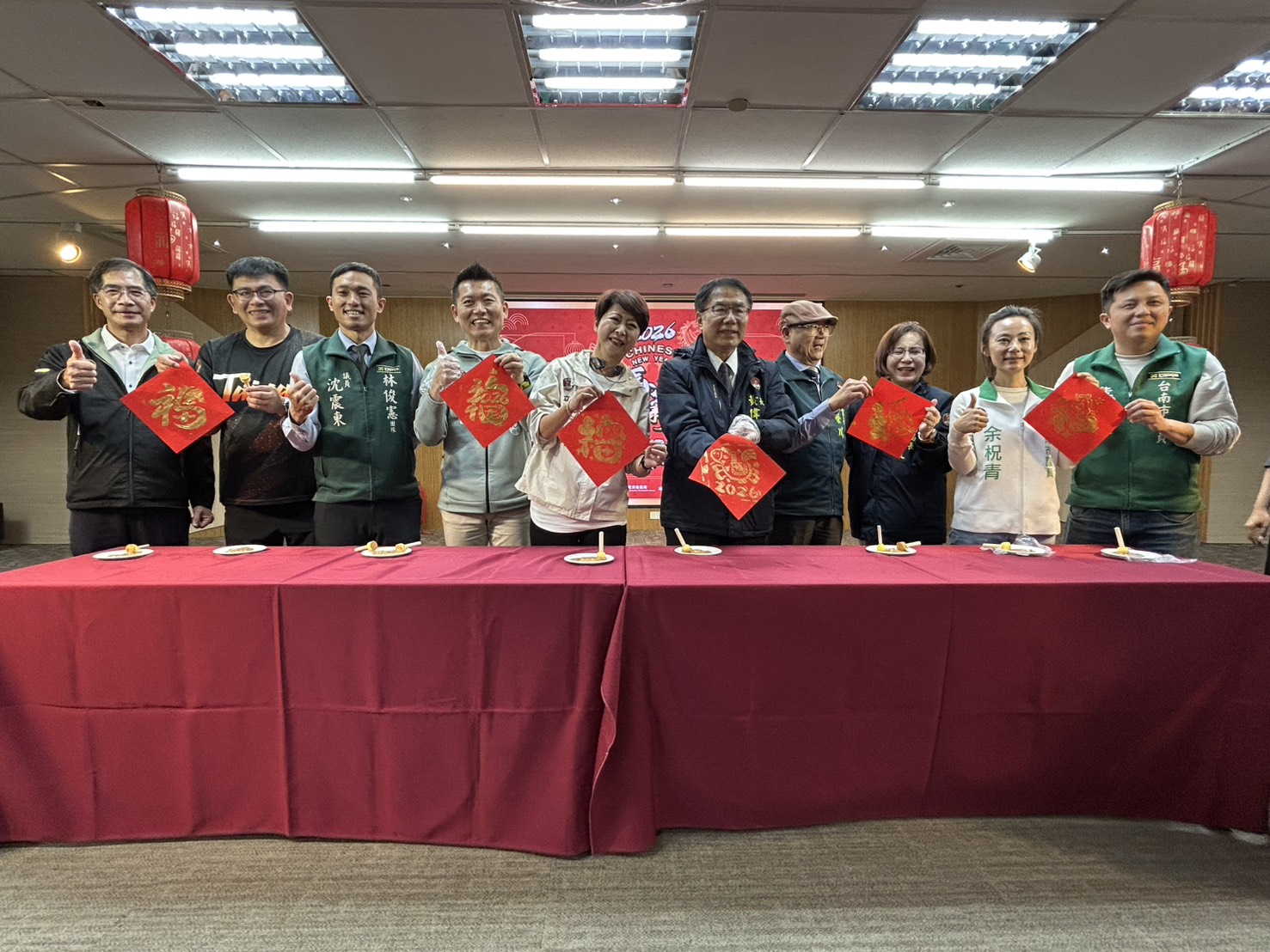 ▲市長黃偉哲與立委陳亭妃等議員、貴賓一起拓印春聯,祈求年貨大街生意興隆。(記者黃雋淮 攝)