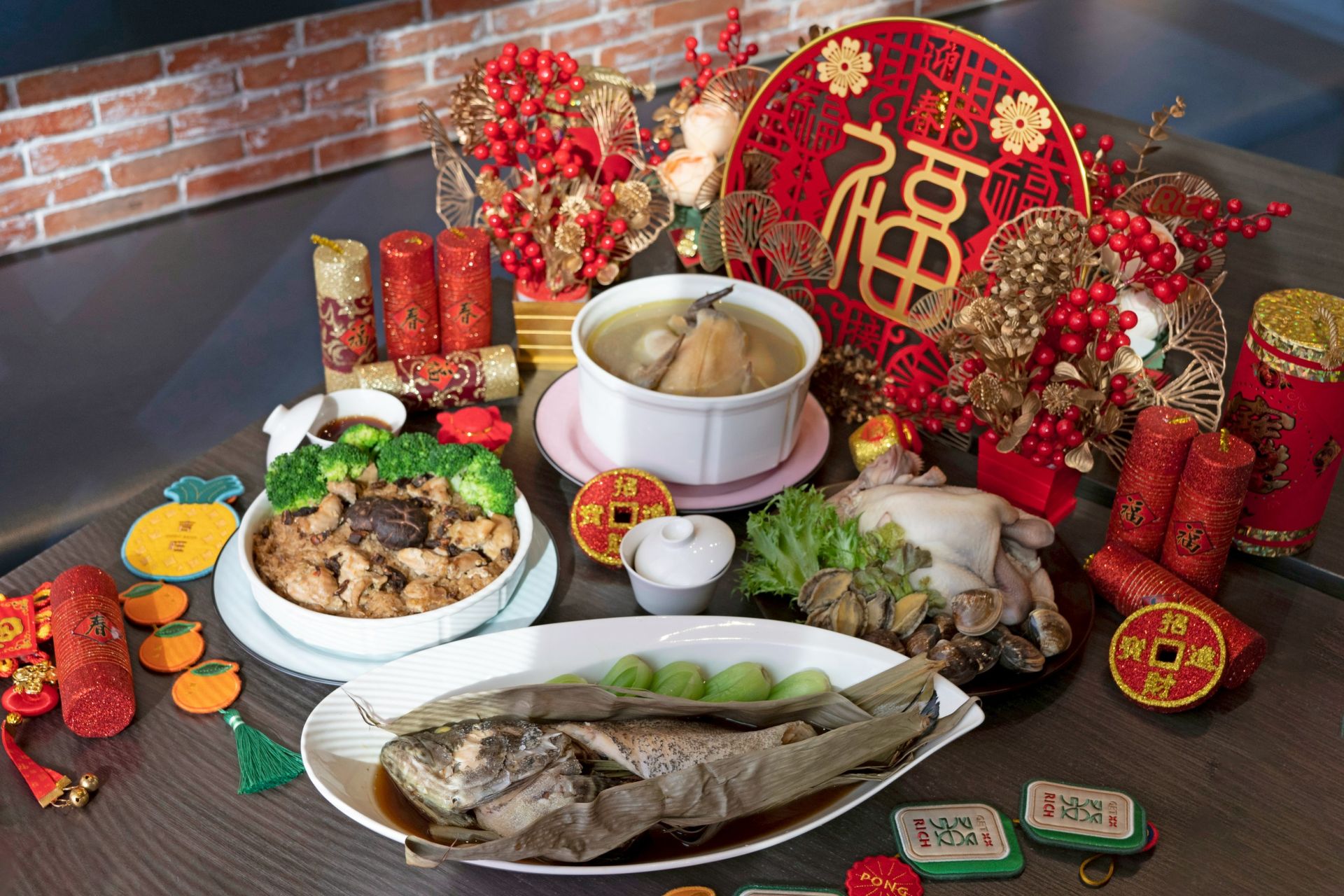 牛肝菌油蔥米糕$988(左)、仙藥鮑魚燉雞湯$1,288(右)、竹葉蝦乾海上鮮$1,288(前),為農曆新年內用套餐內菜餚,亦可提供外帶自取