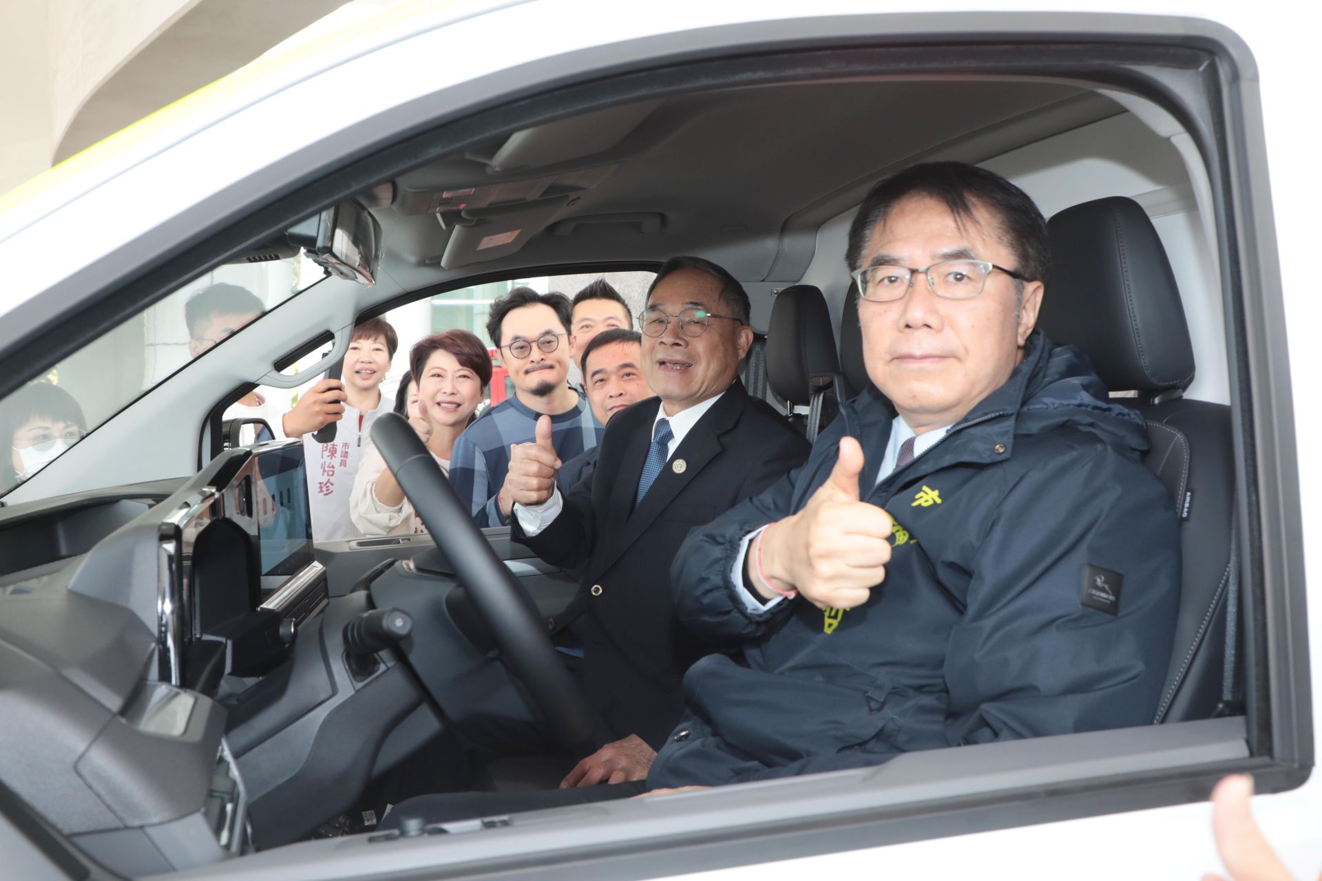 ▲市長黃偉哲與南泰億建設股份有限公司董事長郭福文坐上新救護車,期望能救更多幫助的患者。(南市府 提供)