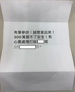 【Lai傳媒、記者爆料網/周庭慶/台北報導】1名陳姓男子去(2025)年與具有太陽聯盟背景的蔡姓男子合夥投資生意發生債務糾紛,談判破裂後指揮小弟於3月至5月間在被害人住處、公司多次埋伏,以丟雞蛋、潑油漆及張貼寫有「有事參詳!誠意拿出來!300萬買不了安全!」等文字的紙條恐嚇陳男,並送花生禮盒至管理室暗示「吃子彈」,還在陳男的車上裝GPS追蹤器當街攔車,行徑極為兇狠!刑事局會同多個單位緝捕蔡姓主嫌等15人到案,依組織犯罪防制條例等罪嫌移送法辦。
