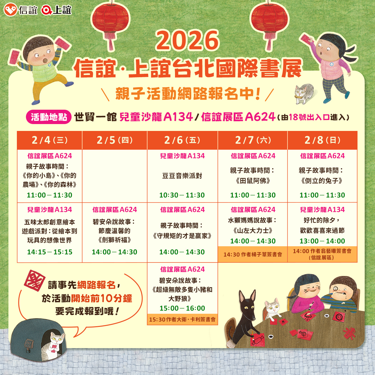 展期信誼規畫三大主題互動區、每日安排故事活動、三場簽書會外,同步推出社群分享活動,邀請讀者在展區拍照上傳到個人FB、IG,標註「#國際書展我在信誼A624」便可獲得限量繪本金句小卡乙張。信誼也在書展推出多項優惠活動,包括全場單件79折、5件7折,桌遊紅綠配兩件69折、滿額送等等優惠,歡迎讀者到A624信誼展區選購,來一場跨越紙本、平面文字,結合閱讀、遊戲、手作、音樂的立體閱讀饗宴。信誼2026國際書展活動報名: https://pse.is/8ndwqk