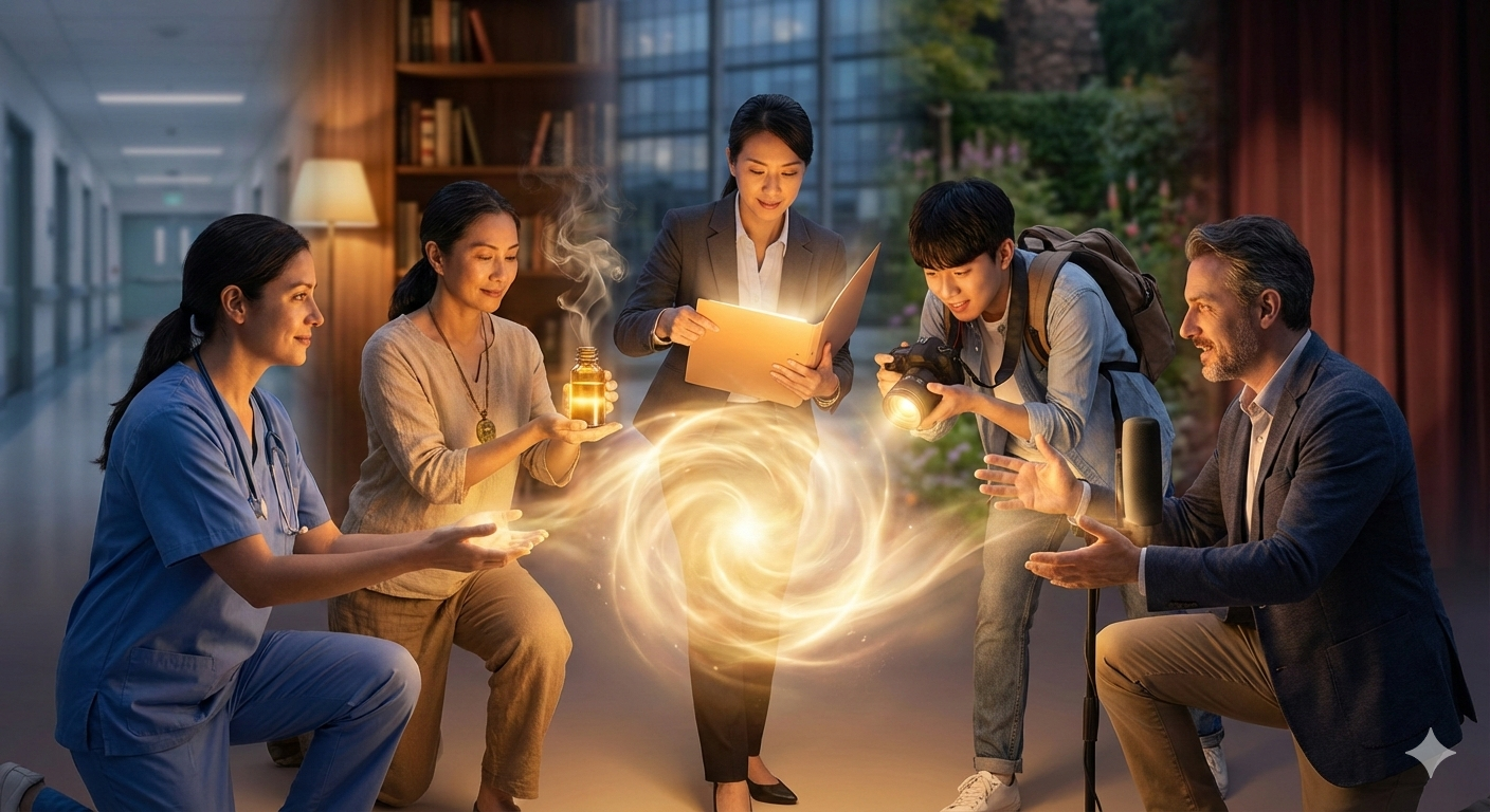 覞傳媒的成員來自四面八方——演講會的溝通專家、熱血的大學生、守護風險的保險業、傳遞療癒的精油業,以及站在第一線的醫療業。