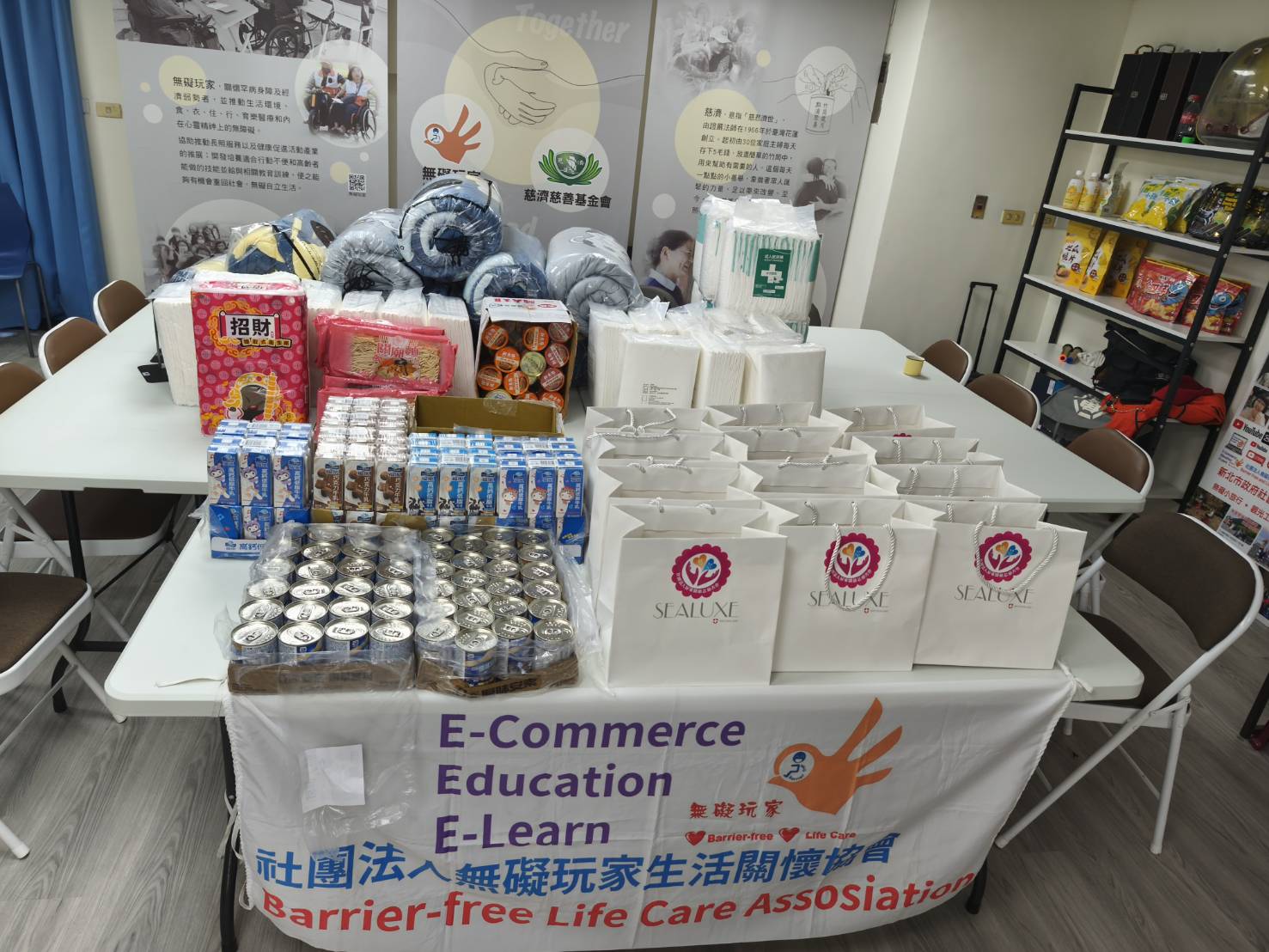 物資滿滿如百貨 棉被、營養品暖進心坎裡 為了讓會員們過個好年,無礙玩家中心內特別準備了多樣化的生活物資。從日常必備的泡麵、罐頭、保久乳,到體貼身障朋友需求的尿布與尿布墊;針對體力補給,協會更貼心備妥了營養安素補充品。最令人感到溫暖的,莫過於那厚實的新棉被,讓領到的會員笑著說:「今年冬天可以不怕寒流睡個好覺了!」