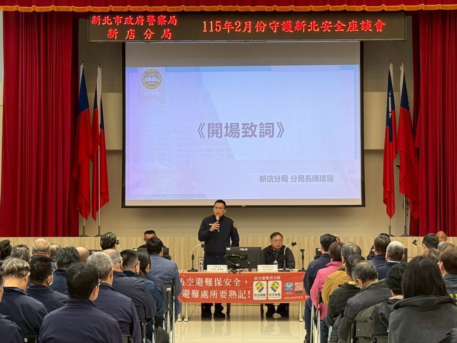 新店分局為因應氣候變遷及全球地緣政治發展情勢,提升民眾面對災害及各類突發事件之應變能力,邀集地方議員、里長、義警、民防、義交、志工、金融機構、中小學校及飲酒處所業者等,共有140人與會。說明可能發生之災害模式,指導與會人員災害發生時的應處作為,強化自我保護及應變能力,攜手守護家園安全。
