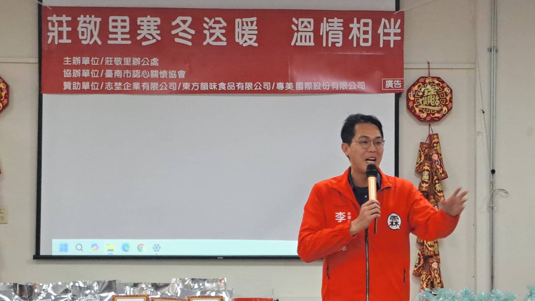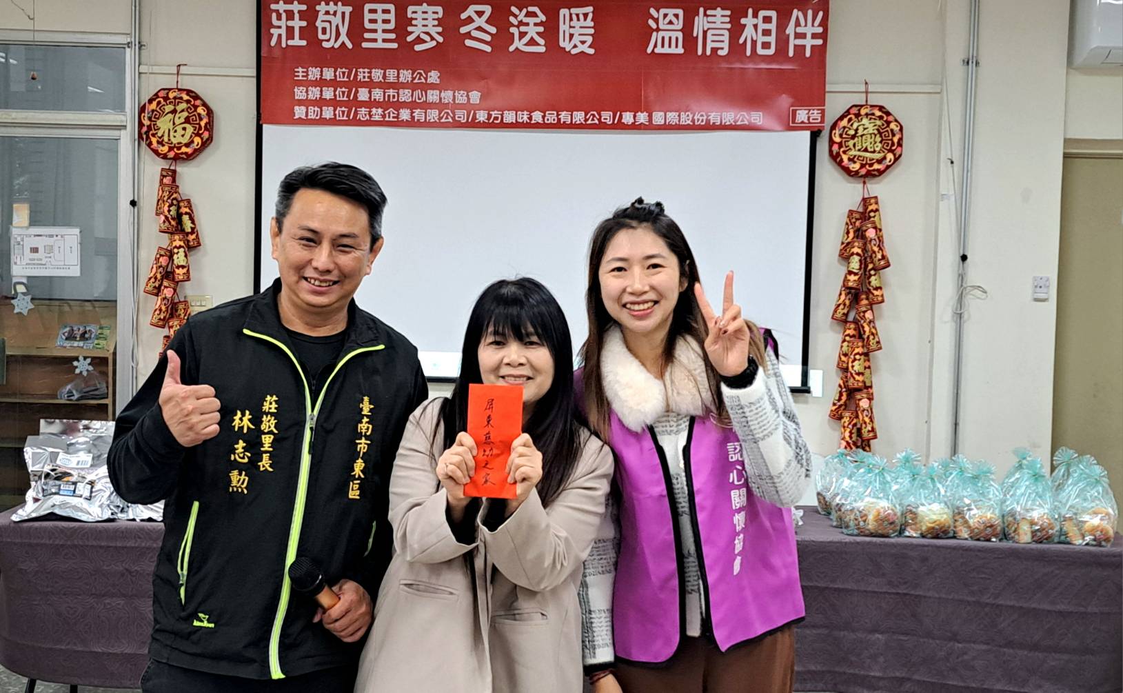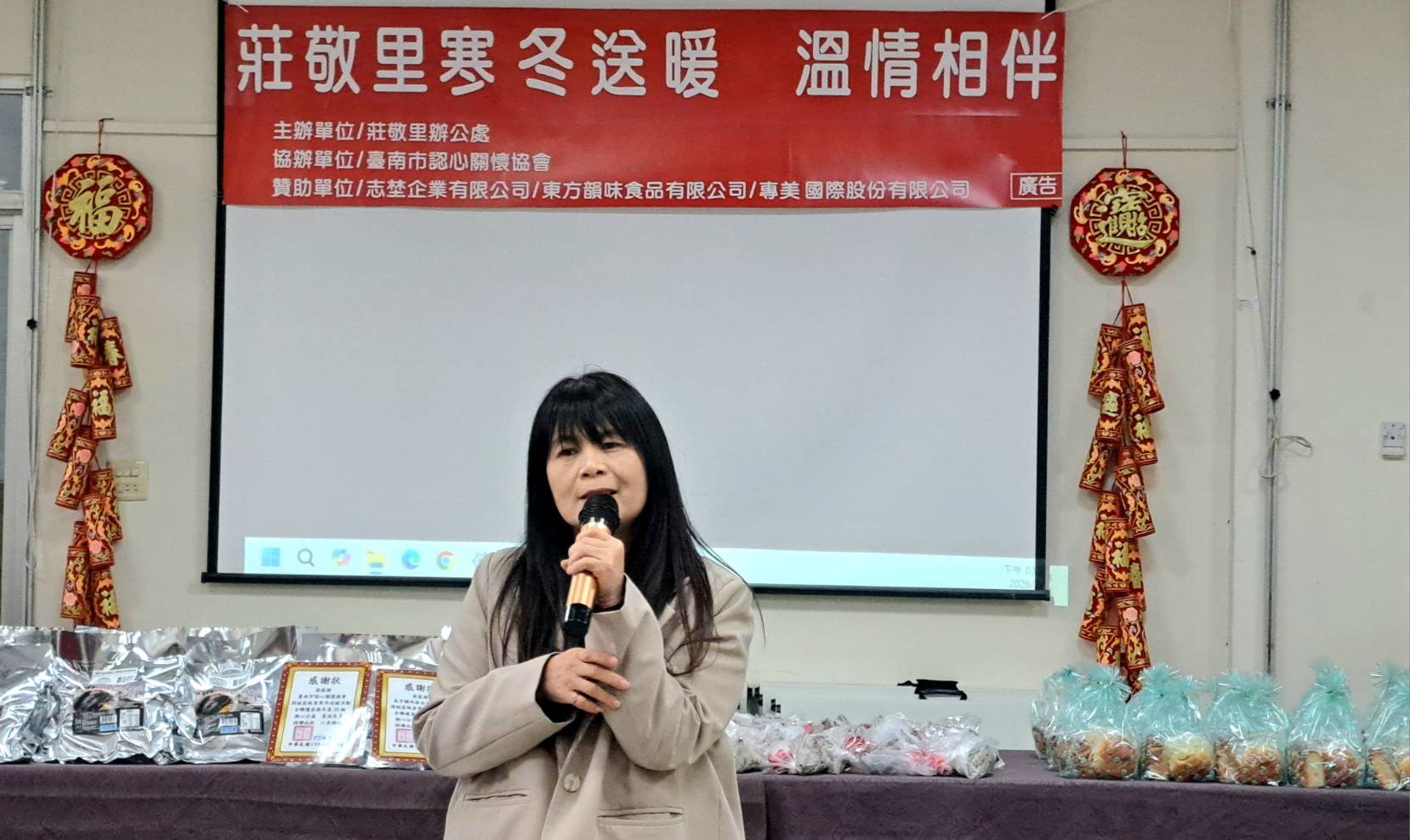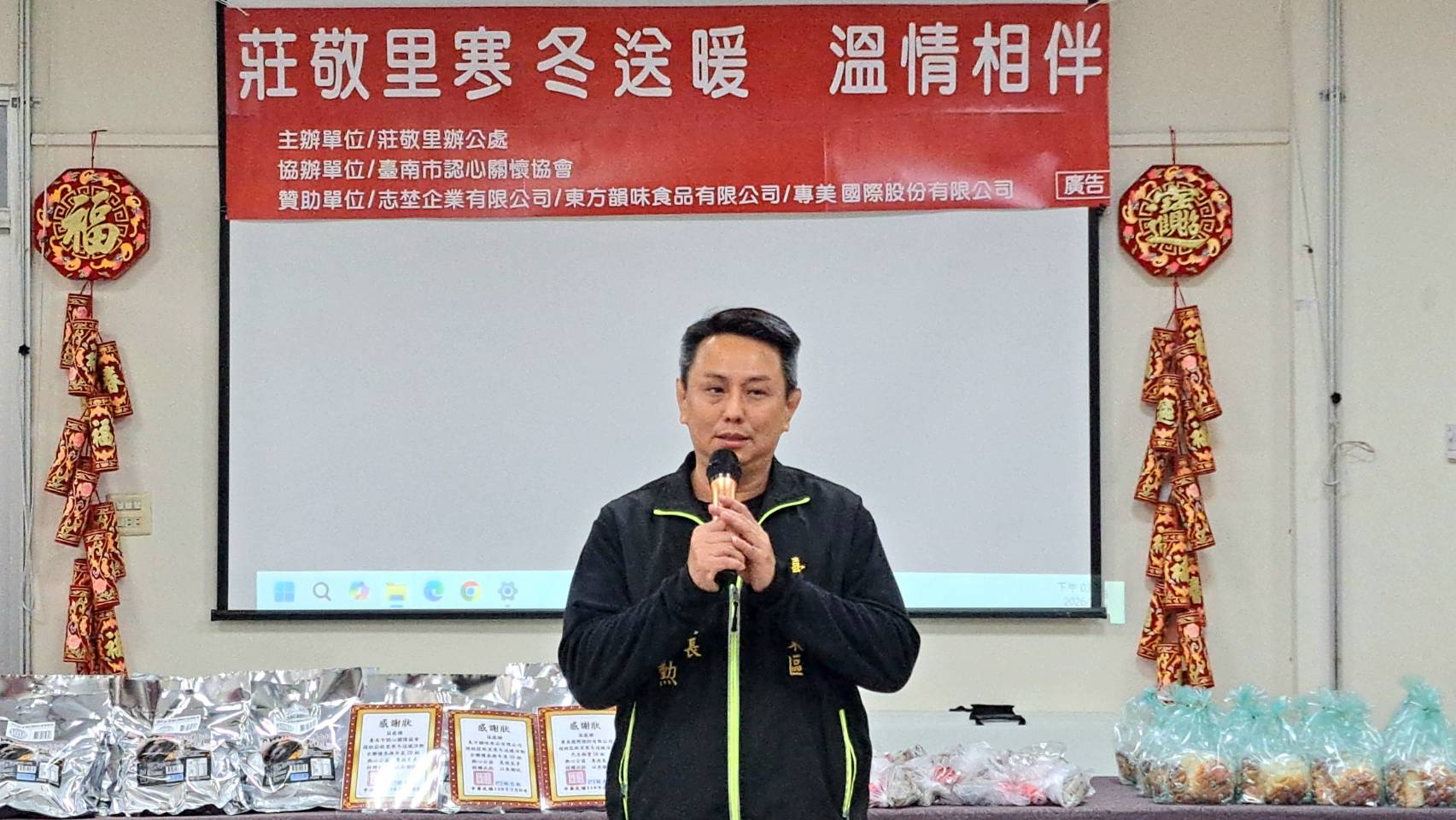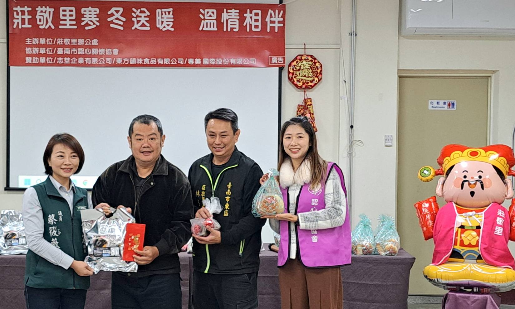 農曆新年將近,社區一份關懷往往能帶來最實際支持;由臺南市東區莊敬里主辦「 寒冬送暖 溫情相伴 」關懷活動,於2月8日下午15時假莊敬里活動中心舉行,在臺南市認心關懷協會協辦下,結合企業資源共同投入公益,針對里內低收入戶、中低收入老人及獨居長者提供生活物資,讓溫情在社區中持續流動。