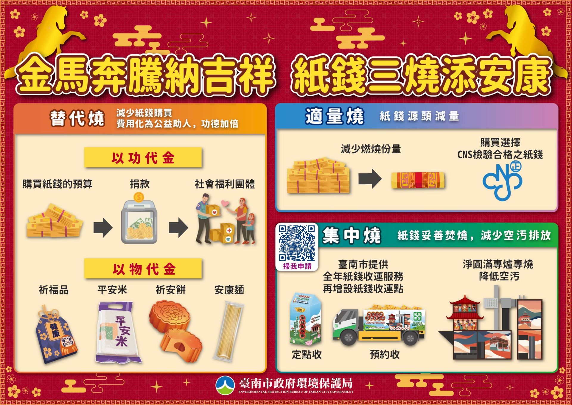 喜迎 2026 金馬年,不少民眾會安排春節期間至廟宇參拜祈福。臺南市環保局呼籲市民與遊客,在祈求平安的同時,能以實際行動守護環境,落實「紙錢少少燒,福氣多多招」的環保祭祀理念,讓環保祭祀成為守護府城的新行動。