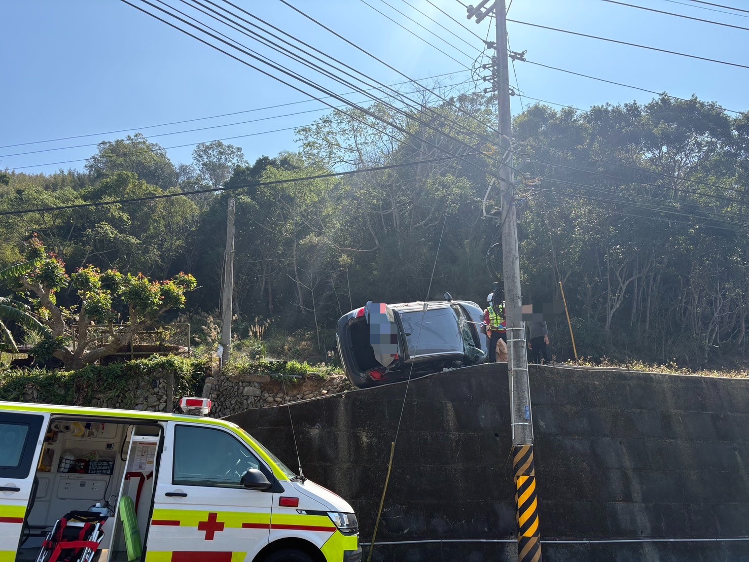 自小客車側翻停在農路邊緣,差一點就墜落5公尺下的台3線路面。翻攝畫面