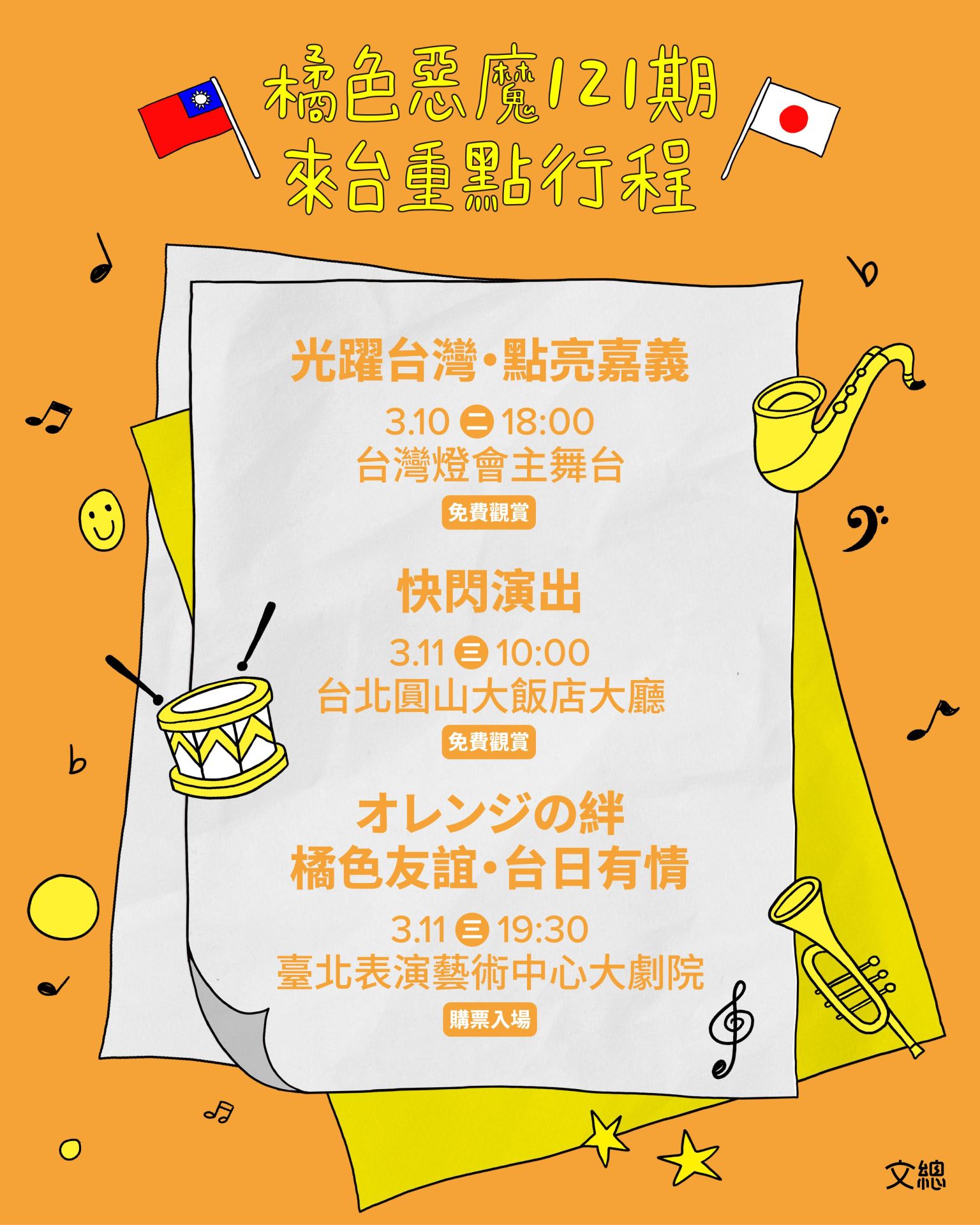 橘色惡魔121期3月10日晚間6點將在「光躍台灣・點亮嘉義」主舞台演出,帶來多首精彩曲目,本次演出特別為台灣粉絲準備紀念曲目,透過精彩演出傳遞滿滿心意。