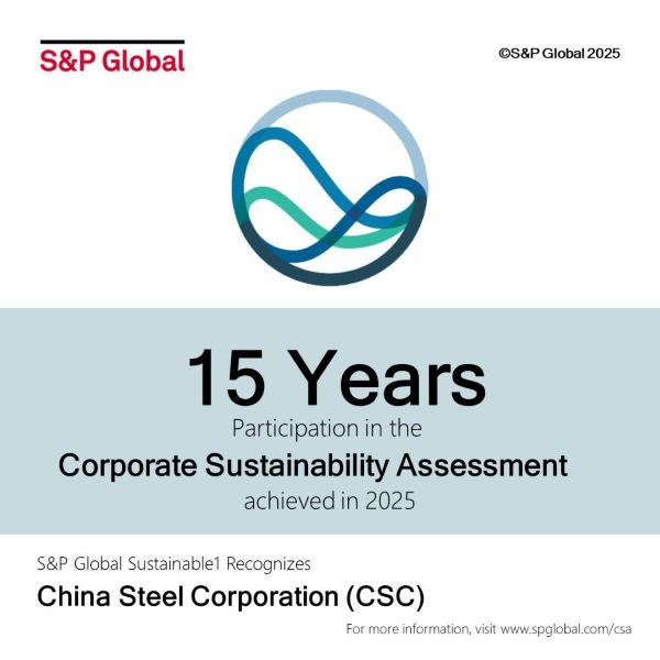 中鋼永續經營的決心及資訊透明度不僅深獲國際公正機構的高度肯定,中鋼也因為參與CSA評比長達15年,S&P Global特別頒予《參與S&P Global CSA 15週年》紀念徽章,象徵著中鋼在永續發展領域上,展現努力不懈的企業精神。面對近年來鋼鐵市場景氣循環變動劇烈、地緣競爭及碳定價、碳關稅與碳中和等三碳挑戰,中鋼已全面啟動永續治理及行動方案,將持續深化ESG工作,攜手用鋼產業夥伴,共同在全球競爭下升級轉型,朝永續經營目標前進。
