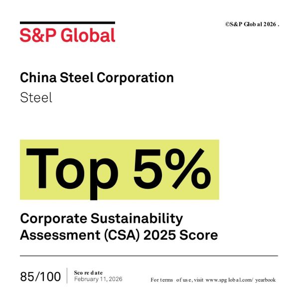 【視傳媒記者吉雄世高雄報導】國際永續評比機構標普全球(S&P Global)日前公布入選《2026年標普全球永續年鑑》(S&P Global Sustainability Yearbook 2026)名單,中鋼2025年企業永續評比(Corporate Sustainability Assessment, CSA)成績名列前茅,以全球鋼鐵業第二名之姿,榮獲《2026年標普全球永續年鑑》Top 5%殊榮。另外,中鋼連續15年參與S&P Global CSA評比,也獲頒《參與S&P Global CSA 15週年》紀念徽章,以表彰中鋼全力推動永續發展的決心與行動力。