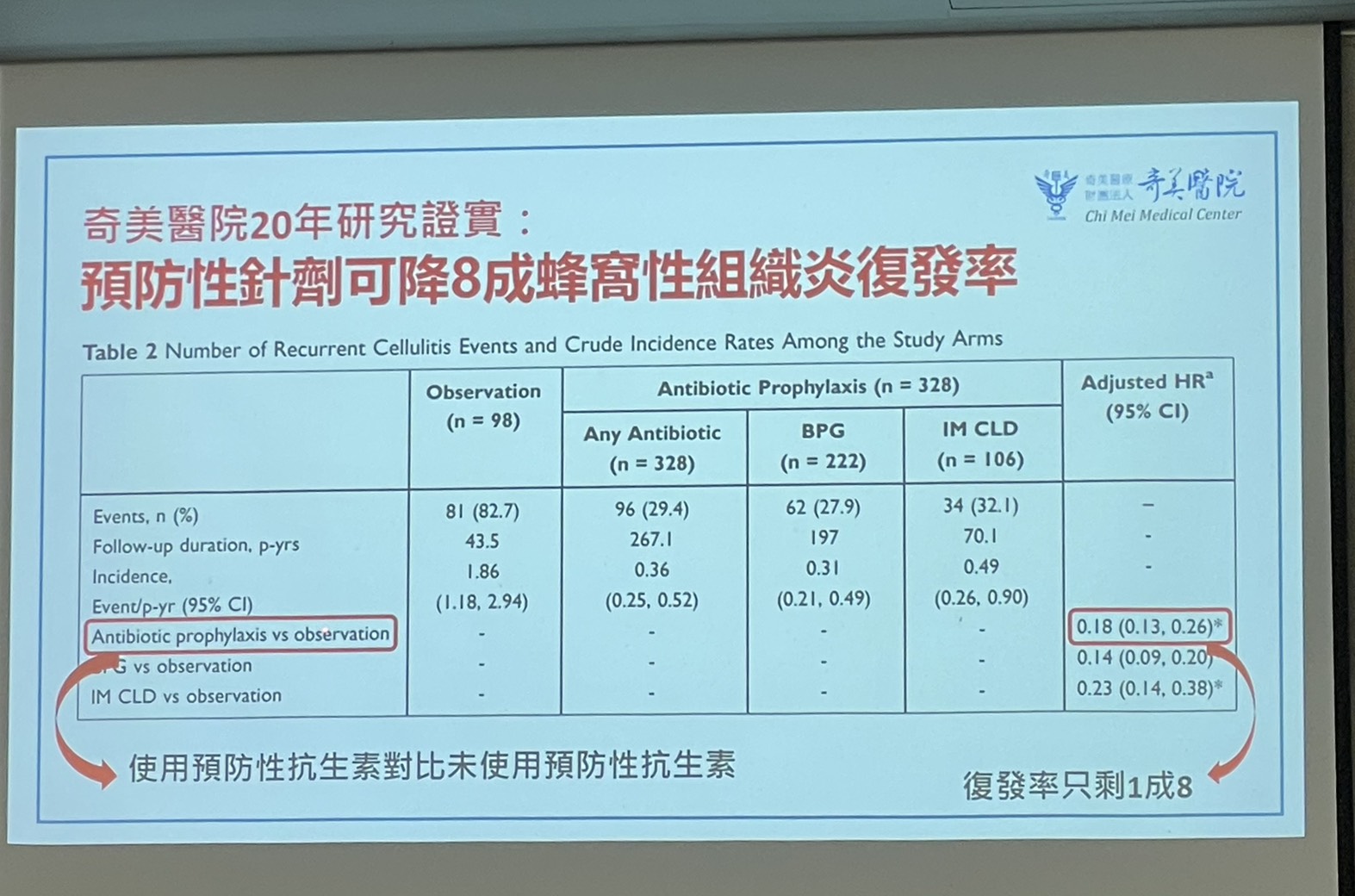 陳宏睿說明,蜂窩性組織炎主要由細菌經由皮膚破口進入皮下組織所造成,常見症狀包括局部皮膚紅、腫、熱、痛,嚴重時可能伴隨發燒或全身不適,約有三成以上病人可能在未來數年內反覆發作,嚴重影響生活品質。奇美醫院進行一項追蹤長達20年的臨床研究,針對426名反覆感染者發現,透過每月定期施打預防性抗生素,能將復發風險從未治療的82%降至約27%至32%,整體風險降低77%至86%。