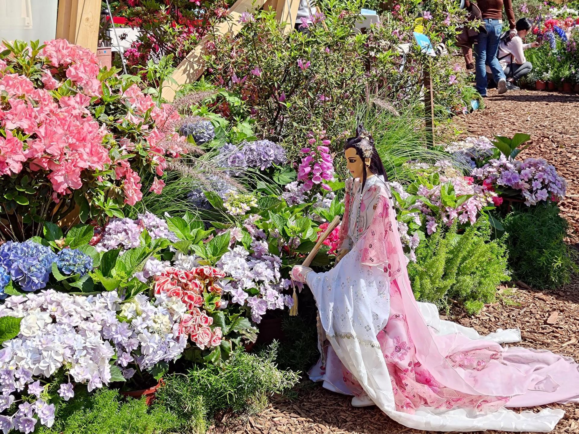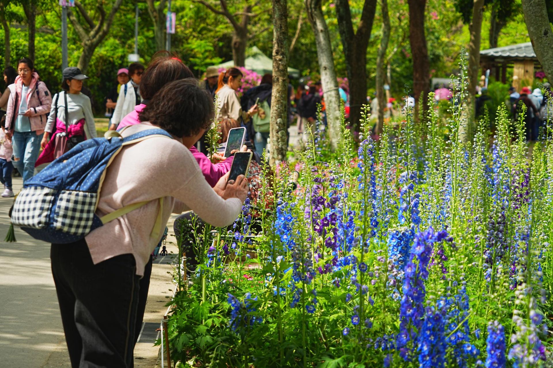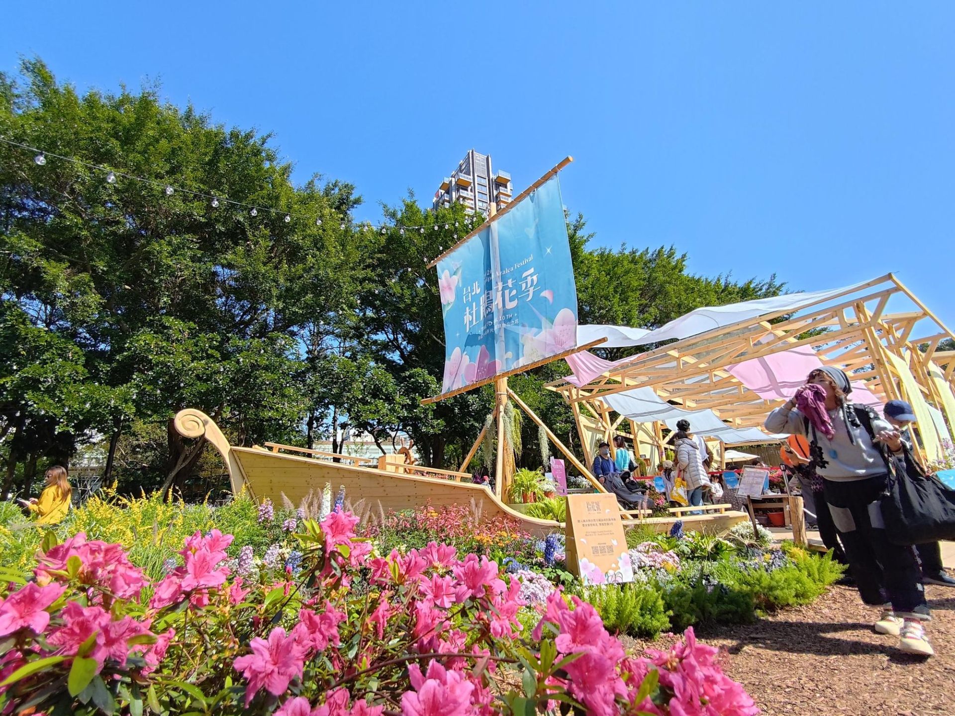 此外,大安森林公園內也驚喜加碼!由大安森林公園之友基金會打造的花藝展區,除展示高達成人身高的平戶杜鵑外,更集結紅、粉、藍、紫、白等繡球花,形成夢幻花景。今年更首度融入日本「花手水」概念,將落花化作水中藝術,讓遊客近距離欣賞花影流動之美。園區沿線還有醉蝶花、金魚草、大飛燕草等春花接力綻放,層層堆疊春日色彩。