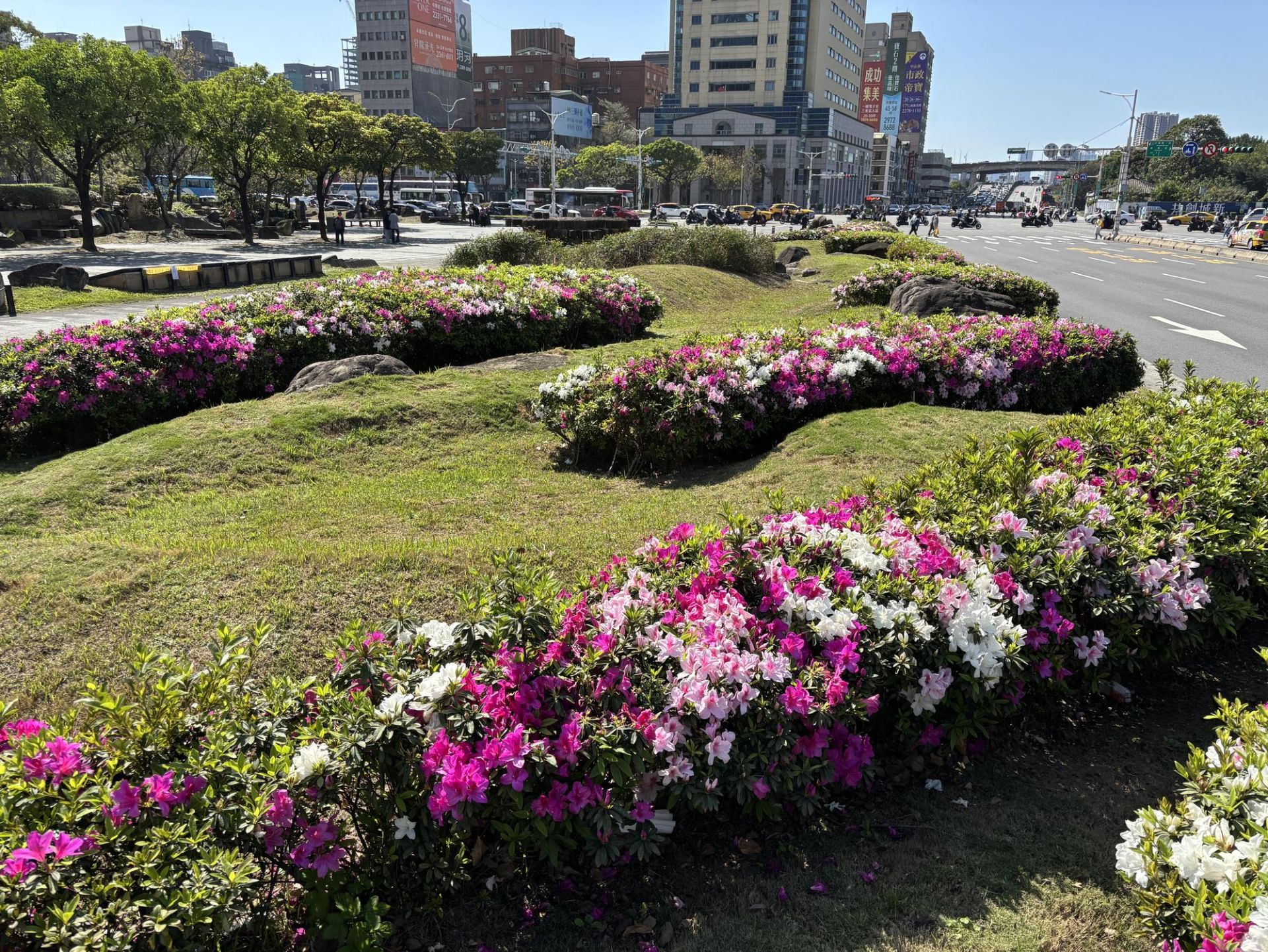 不只公園精彩,城市街景也同步上演花開盛事!目前道路杜鵑開花約三成,北門廣場花帶已率先吸睛,為通勤族帶來療癒風景;愛國西路、新生南路臺大周邊陸續綻放,而深受期待的仁愛路與艋舺大道「杜鵑大道」,也蓄勢待發,即將迎來壯觀花景。
