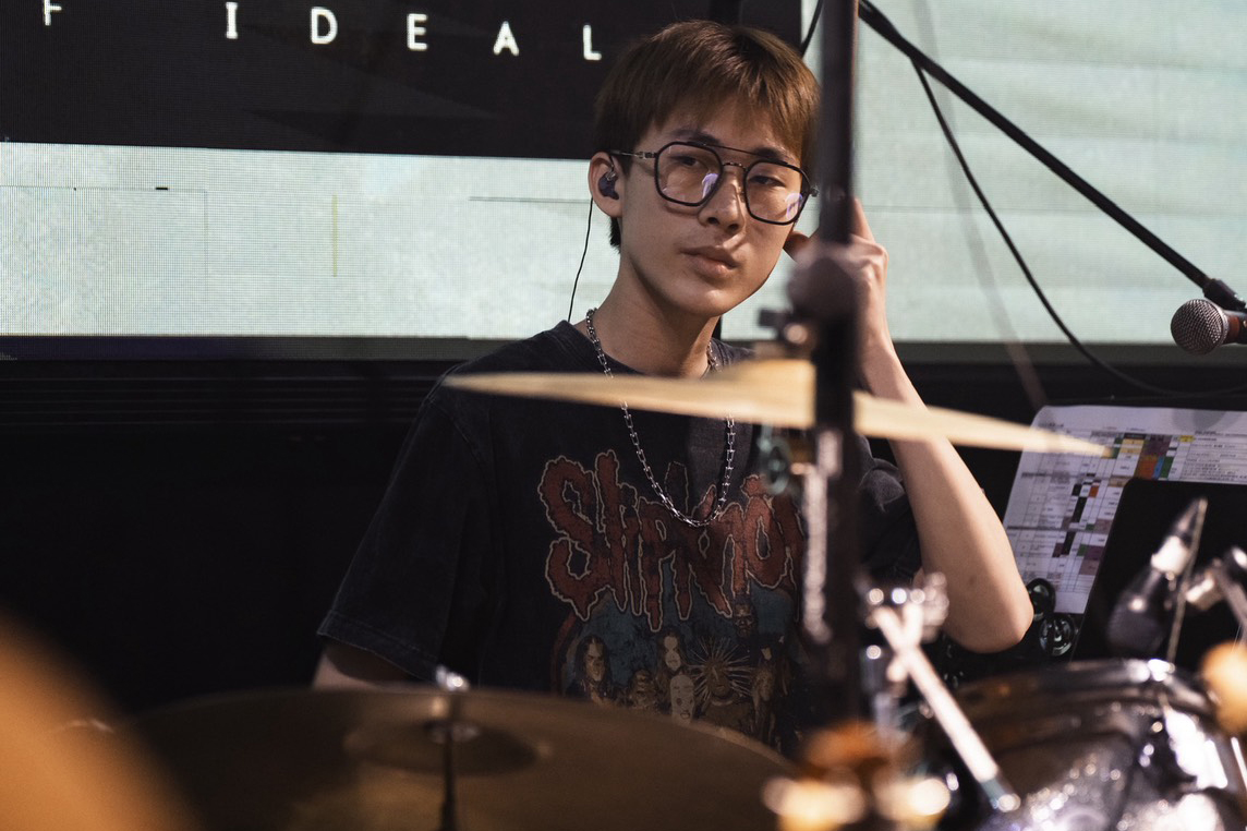 現在的他,除了持續精進個人技巧,也在樂團中參與創作與排練。從一個人在夜裡對著腿敲節奏,到在老師指導下建立更完整的演奏能力,再到與夥伴一起完成音樂,邱繹睿的世界,正在一步步變大。