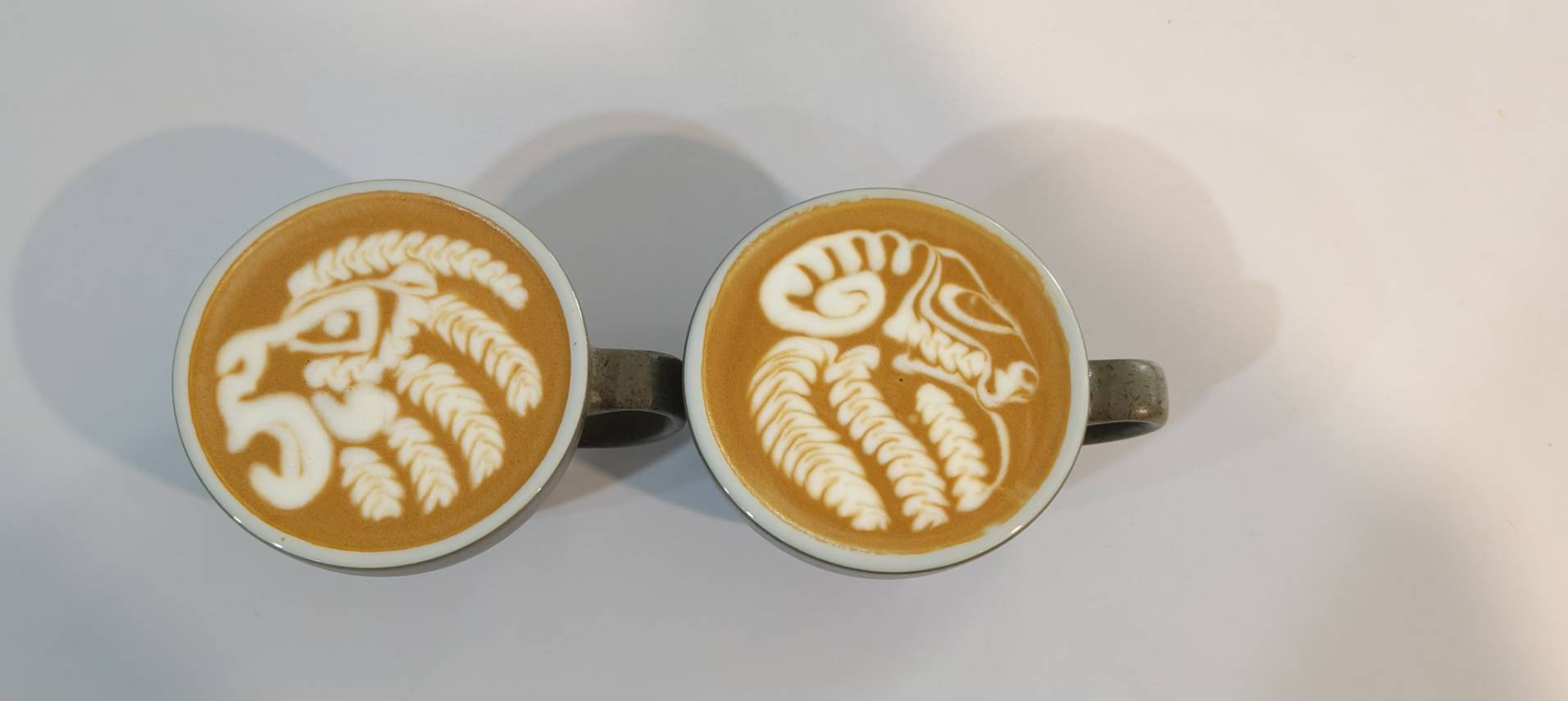 ▲林鉦哲的拉花作品《獅子》(左)與林泓翮的拉花作品《山羊》,包辦了景大盃的冠亞軍。(圖/崑山科大提供)