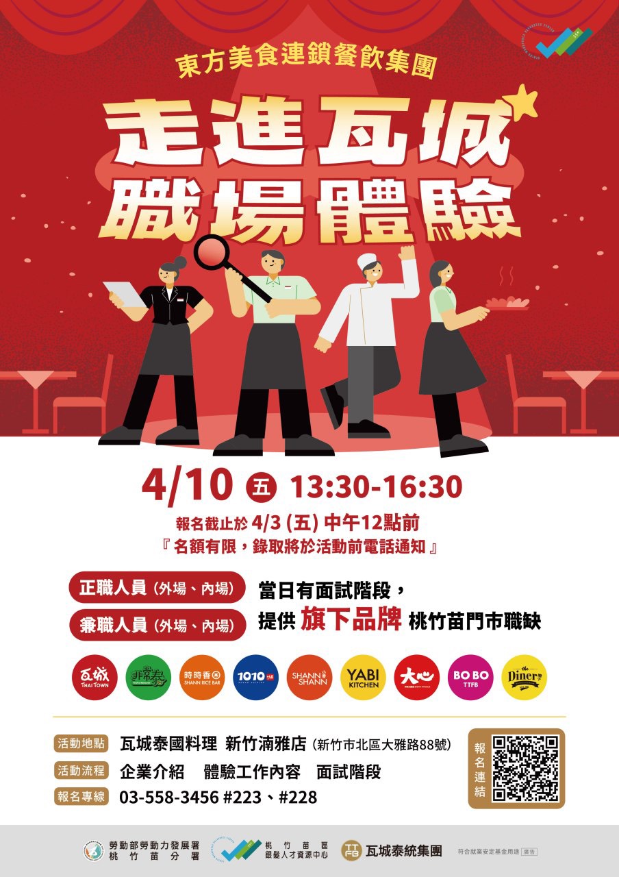 為協助中高齡者順利重返職場、降低對新工作的陌生感與適應落差,並進一步強化其就業信心,勞動部勞動力發展展署桃竹苗分署銀髮人才資源中心於4月10日(星期五)下午1時30分至5時00分,在瓦城泰國料理新竹湳雅店舉辦「走進瓦城」職場體驗暨徵才活動透過「先體驗.再就業」的方式,讓求職者能實際參與工作內容、提前了解職場樣貌。活動採線上報名,歡迎民眾踴躍參加( https://reurl.cc/dp2rVg )。