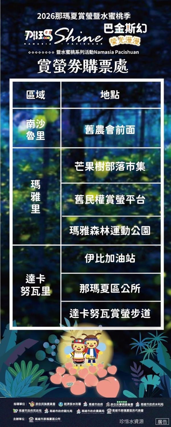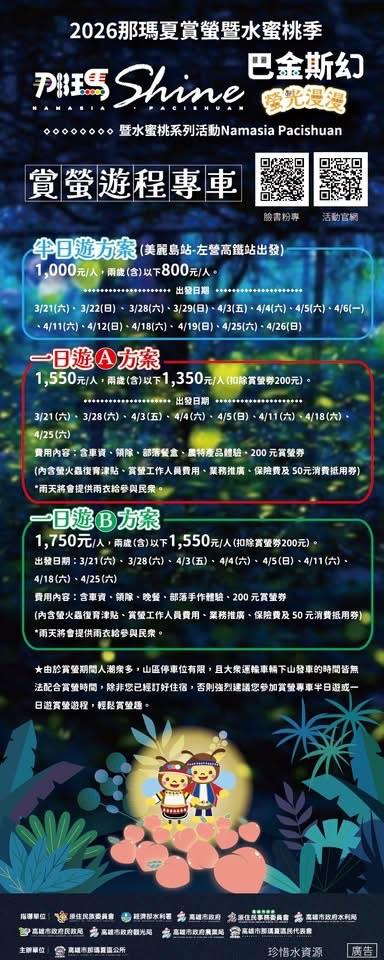 那瑪夏區長孔賢傑表示,區內融合農業生產、自然生態與原住民族文化特色,想預約賞螢一日遊或半日遊、了解更多資訊的民眾,可關注那瑪夏賞螢季臉書粉絲專頁。孔賢傑提到,賞螢季期間設有漂漂河及氣墊水樂園活動,及大型裝置供民眾拍照打卡,賞螢券則是每張200元含消費抵用券,2歲以下兒童賞螢免費。4月更是安排部落演唱會,希望藉此提升遊客體驗,也鼓勵支持在地產業。