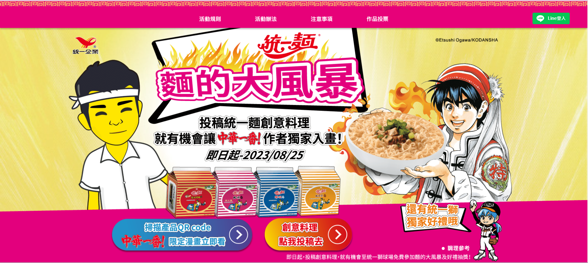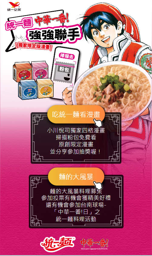 身為許多台灣人回憶殺的「中華一番!」作者小川悅司,日前於社群中發文驚喜公開與統一麵的合作,本次合作為了台灣廣大的粉絲們,小川悅司創作了屬於台灣人的回憶「統一麵」的專屬漫畫,有網友在論壇中分享第一篇漫畫,引起許多回應大讚「太神啦!」、「泡麵泡好打開是不是會飛出一條龍」等熱情討論。除掃瞄統一麵包裝的QR code就可以看到漫畫外,將活動訊息分享至個人FB主頁即可立即抽獎,不只有機會拿到專屬統一麵&「中華一番!」碗筷套組,還有機會獲得統一獅Q版阿昴磁鐵徽章!