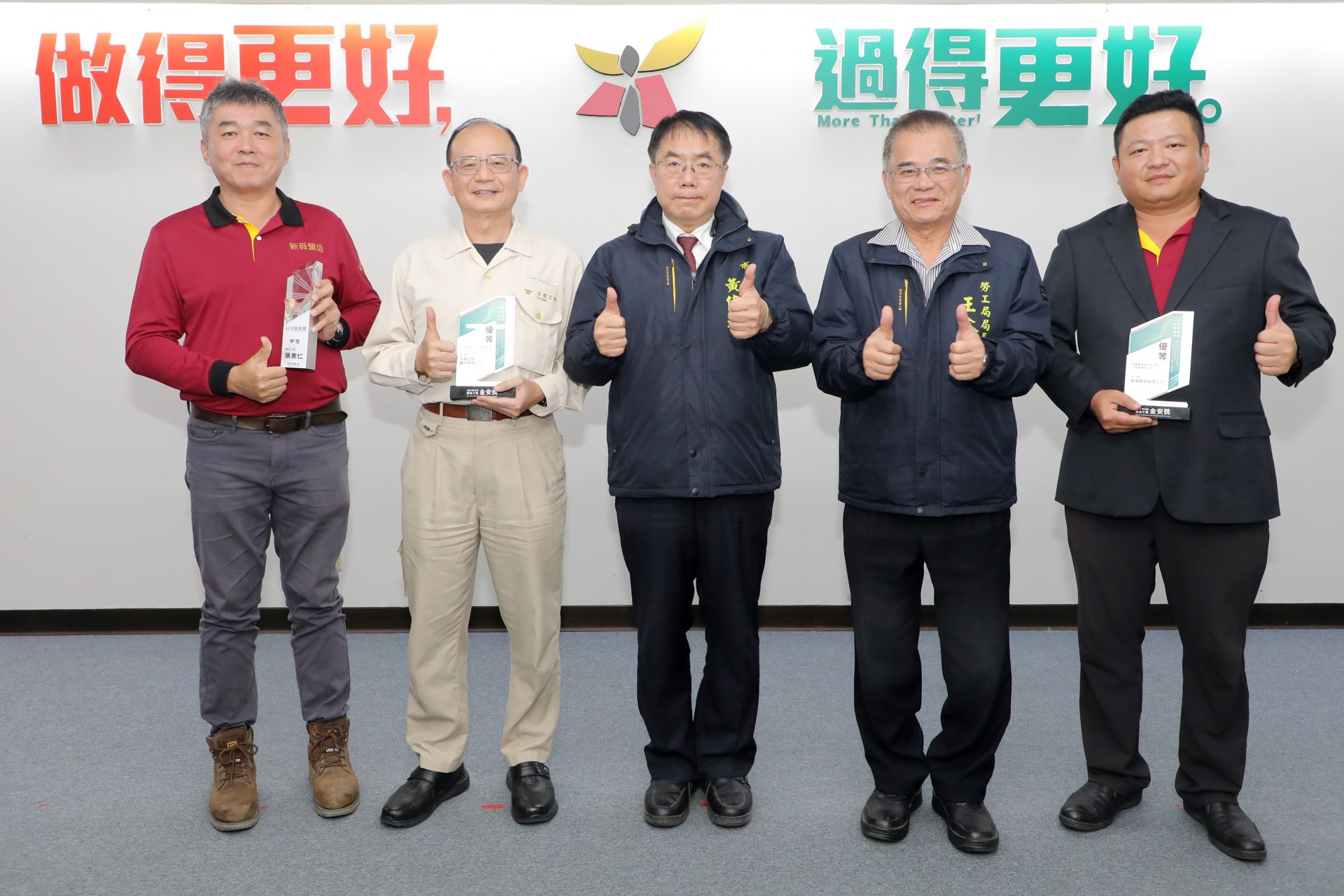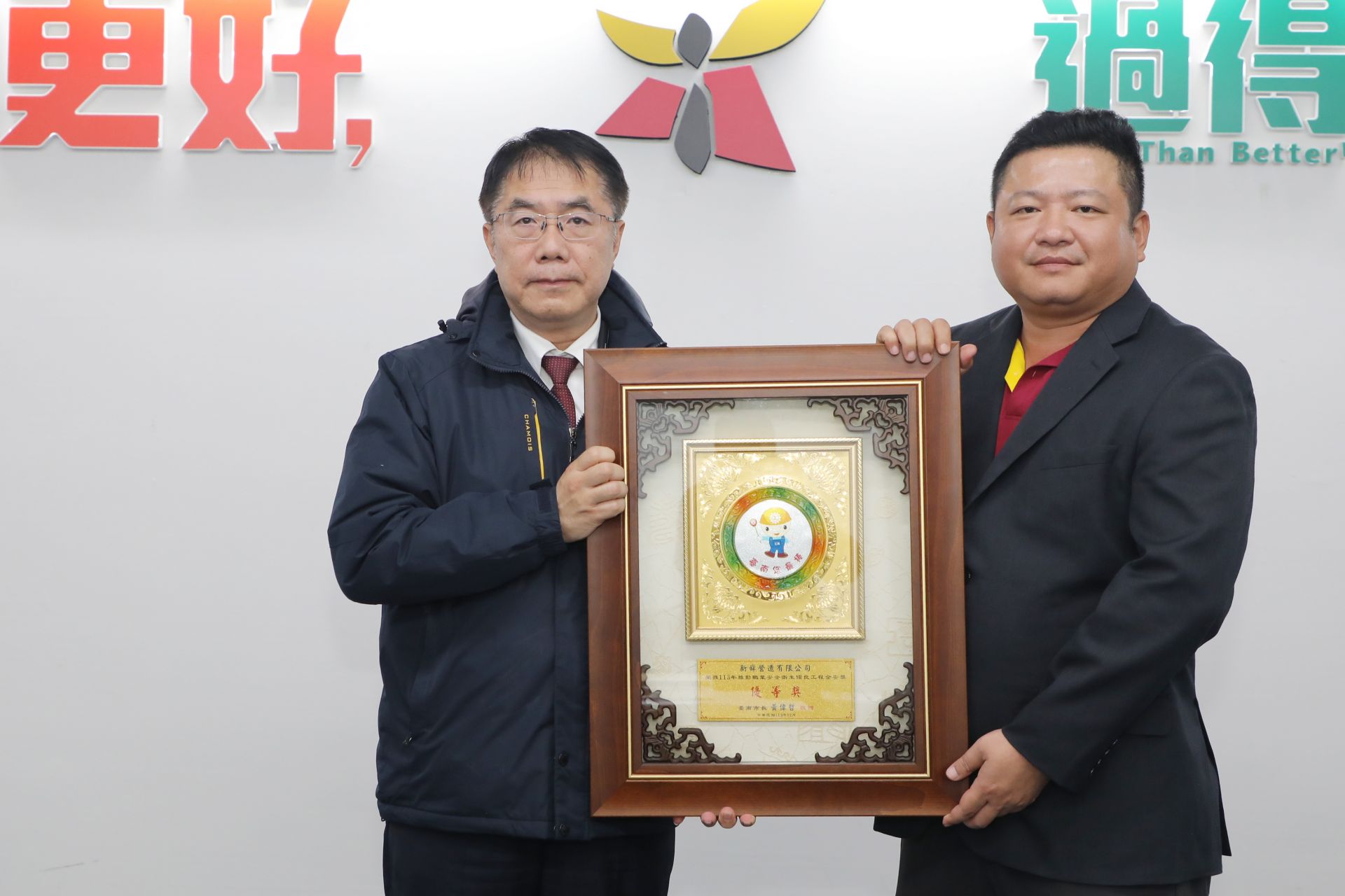 獲獎單位於今(12/31)日市政會議中,將中央所頒的獎座獻給市長黃偉哲,和市府團隊及全體市民朋友共同分享這份殊榮,同時偉哲市長也回贈市府製作的獎牌,表達對獲獎單位在職業安全衛生工作上長期努力奉獻的肯定。