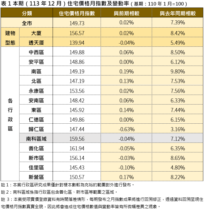 113年12月臺南市住宅價格指數為149.73,較前期(11月)微幅上漲0.02%,相較去年同期則上漲7.39%。以住宅型態而言,該期大廈的價格指數為156.57,透天住宅的價格指數為139.94,與前期相較,大廈價格指數微幅上漲0.02%,透天住宅價格指數微幅下降0.04%。