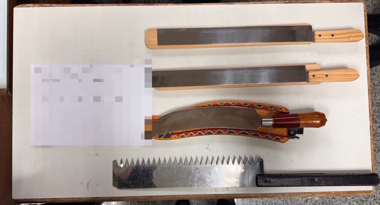 警方調查,當時汽車紅線違停,車上2名男子正在交談,其中駕駛手持電子菸,員警甫靠近便聞到毒品氣味。駕駛自知法網難逃,主動交付2罐第二級毒品「依託咪酯」菸油,但警方進一步搜索,赫然發現車內藏有1枚不明爆裂物、毒菸彈成品與半成品,以及西瓜刀、鋸齒刀等危險物品。